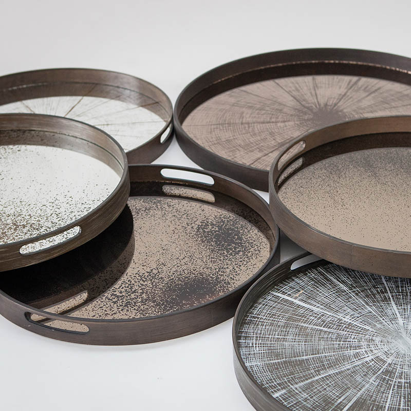Notre Monde 的作品細緻並帶有輕奢感,托盤不僅能作為置物盤,也可以置掛在牆上,或是搭配茶几框架結合為實用的邊桌。除此之外,Notre Monde 不斷發展出復古精美的桌几、掛畫、鏡子和沙發等傢俱,兼顧了空間美學與功能性。